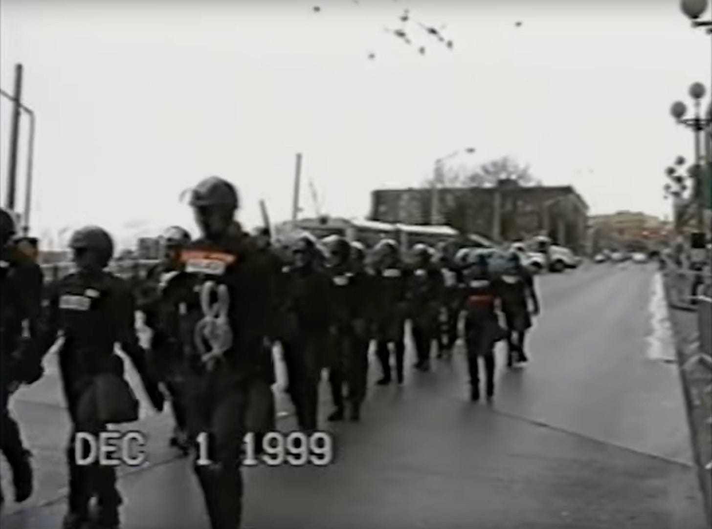 I’m an oral historian; I live for archival media. Making the 2025 film solely from archival video keeps the aesthetic qualities of 1999 intact; it preserves an artifactual view of mainstream news at the time. The accumulation and sourcing of so much footage is formidable—in a particularly noteworthy scene, police and legal observers are filming each other with handheld camcorders from a distance, and the filmmakers have managed to locate and stitch together both perspectives, offering us a sense of completion around that particular moment. But relying so heavily on news footage, and as a result, on protestor voices through the lens of reporters’ interview questions, stages a defensive position for the protestors rather than offering a view of the offensive strategy they so consciously mounted (organizers planned for the disruption for over a year leading up to the event).